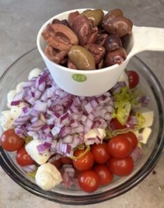Add the olives, red onion, and mozzarella balls.