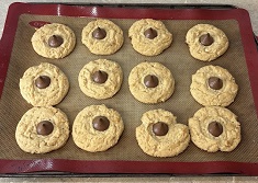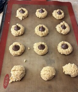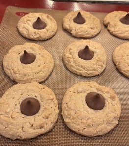- Press the Hershey's Kisses or chocolate stars, point up, into the middle of your cookie balls, flat side down. They'll look like flowers or blossoms after they're baked and that's why they're called Cashew Butter Blossom Cookies.