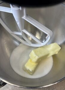 Add the softened butter and mix on LOW until it’s well blended, then beat on MEDIUM speed until the mixture is light and fluffy.