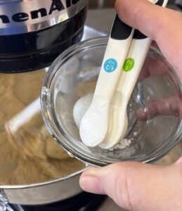 With the mixer running on LOW speed, sprinkle in the baking soda, baking powder, and salt. Mix well.