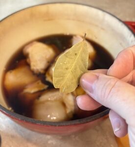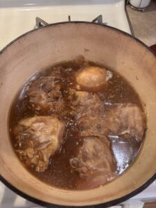 Turn the heat back up to high under the marinade pot and boil the sauce for 20 minutes or more, until it’s reduced by at least half. Some people like it a little drier, others saucier, so boil it until you have the desired amount. Return the chicken to the pot and stir to coat with sauce, then serve with white rice.