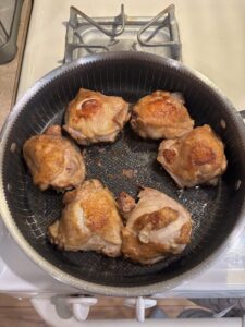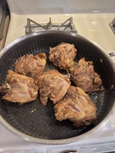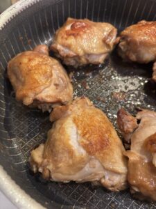 Heat a separate pan on high and add a splash of oil. Brown the chicken on all sides, in batches, until the skin is crisp. Alternatively, crisp the skin under the broiler. Set aside.