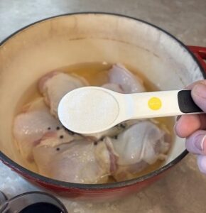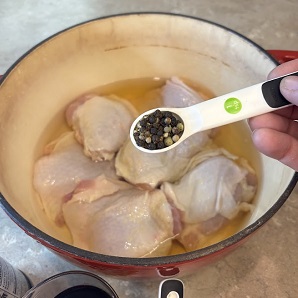 Once the liquid boils, turn the heat down to medium-low and cook for 15-20 minutes until the chicken is cooked through, but not falling off the bone.