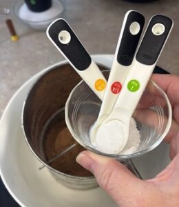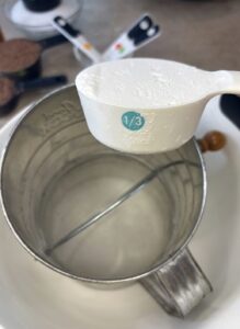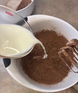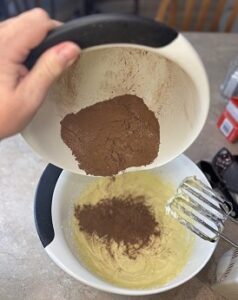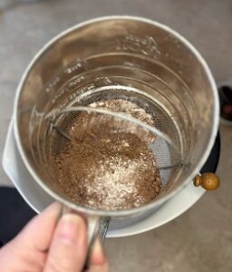• Sift together the flour, baking soda, baking powder, cocoa, and salt. Set aside.