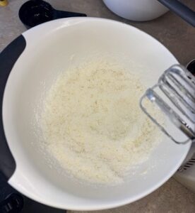 • In a large bowl, cream together the butter and sugar until well blended.
