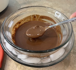 • Let the ganache stand at room temperature for 5 minutes, then move the ganache to the refrigerator and chill until it thickens and becomes shiny and spreadable.