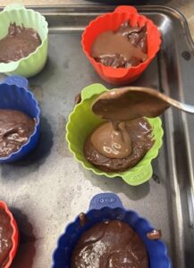 Spoon the chilled lava center onto the batter and cover with remaining batter until the liners are two-thirds full.