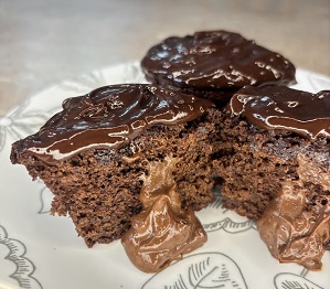 Chocolate cake with melted chocolate in the middle, can be frosted with buttercream or ganache. For this recipe, ganache was used.