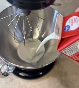 - Pour your heavy cream into a stand mixer (or mixing bowl, if using electric beaters) and beat for about 5 minutes until stiff peaks are formed.