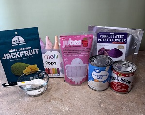 I was not able to find all of these in my local store, so I made a few substitutions. I added chopped dried Jackfruit and powdered purple sweet potato (Ube) to add color and sweetness.