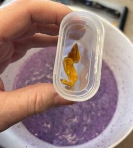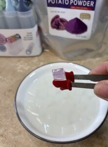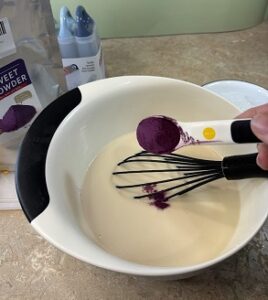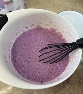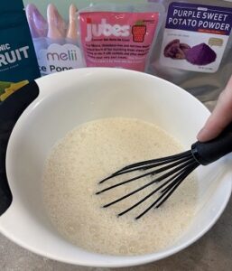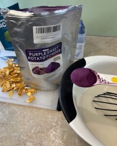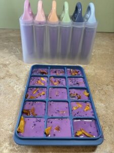 To the liquid I mixed 2 tablespoons of dried Ube powder that is designed for smoothies. It gave the ice candy a great purple hue as well as added nutrients.