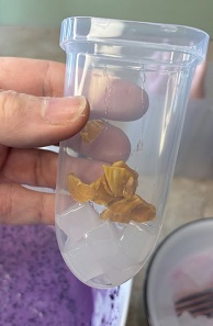 - Use chopsticks or long-handled tweezers to insert 1 to 2 teaspoons of your choice of halo-halo fixings into your plastic bags or ice pop molds. Again, the more fixings you add, the sweeter the overall ice candy will be.