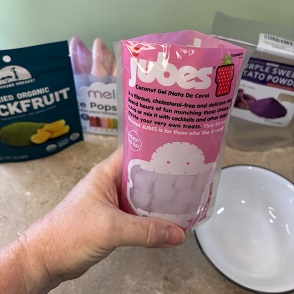 First I added the nata de coco cube, then some of the jackfruit and finally poured the sweet Ube liquid on top. to fill the molds. The jackfruit was unsweetened, but it was definitely sweet. I thought it tasted like dried mango. If you can’t find Jackfruit, then mango would be a great alternative.