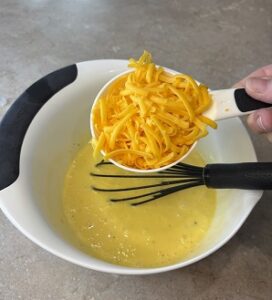 Pour into the prepared baking dish and top with the remaining 1/2 cup cheddar cheese and green onions.