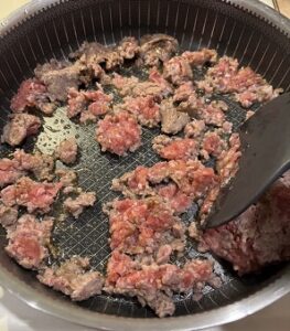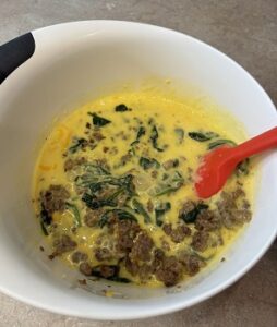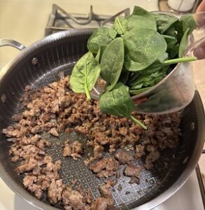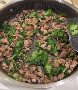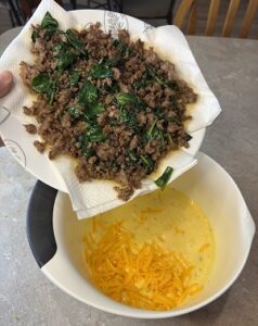 Add spinach and cook for another 2 minutes until spinach is wilted. Set aside and let cool slightly. I put the meat mixture on a plate with paper towels to drain some of the fat.