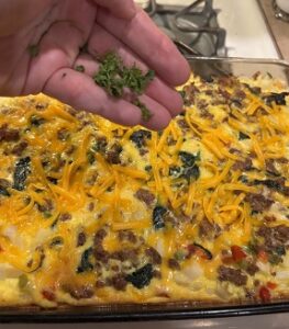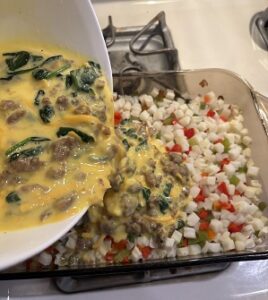 - In a large mixing bowl, combine the remaining ingredients (leaving 1/2 cup cheese and the green onions for topping) with the sausage and vegetables and mix until well combined.