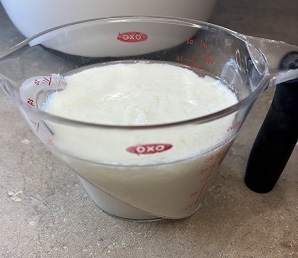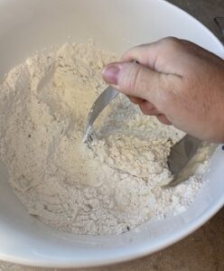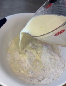 When the butter is pea sized, whisk the buttermilk or milk together with one egg.