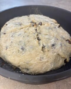 Move the batter to a prepared greased pan. (This can be a pie plate, cake pan, or cast-iron skillet.) Those round pans help the bread keep its shape. Make a cross in the batter with a sharp knife.