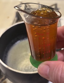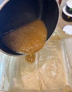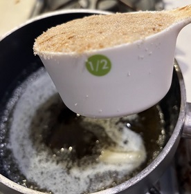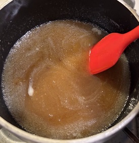 - Add the honey and brown sugar and heat, stirring until smooth.
