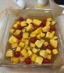 - Pour the mixture into the prepared pan and then place the fruit into the pan, in whatever design you choose. Dot with maraschino cherries.