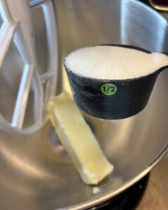 In another bowl, beat the butter and sugar and vanilla with a mixer until they are light in color.