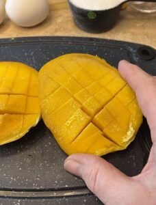 - Peel and cut the mangoes into slices or cubes.