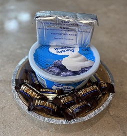 - 7.5 oz (5 regular size bars, 30 mini bars) Heath Bars broken in pieces (save some to sprinkle on top of the pie or crunch more candy)