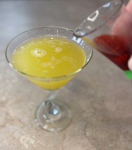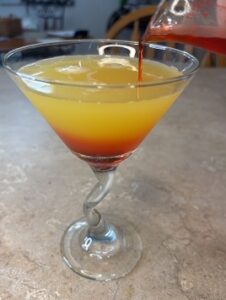 Slowly pour the grenadine in so it settles on the bottom.