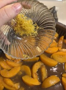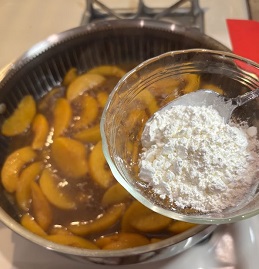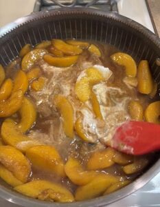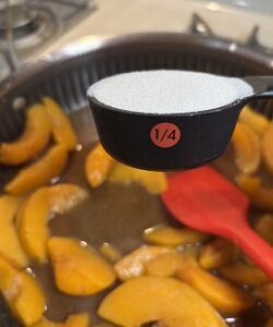 Peel and slice peaches. It wasn’t peach season when I made this, so I used frozen peaches and it still turned out perfect. Don’t thaw the peaches before cooking them.