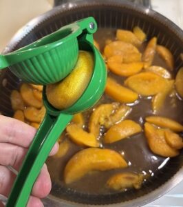 The spices will thicken and cling to the peaches