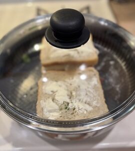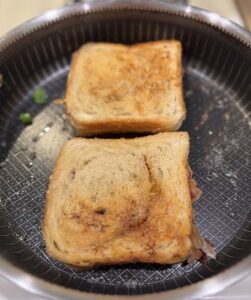 - When the bread in the pan is toasted golden brown, carefully flip your sandwich over and toast the other side until cheese is melted and bread is golden brown on that side.