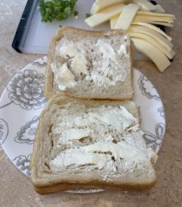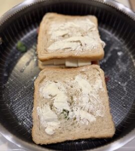 - Butter one side of the second slice of bread and place it on top of bread in a pan butter-side up.