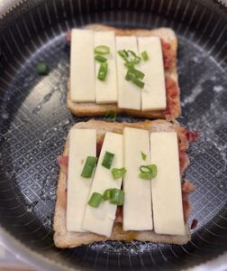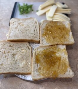 - then spread fig jam on the other and place butter-side down in a heated pan.